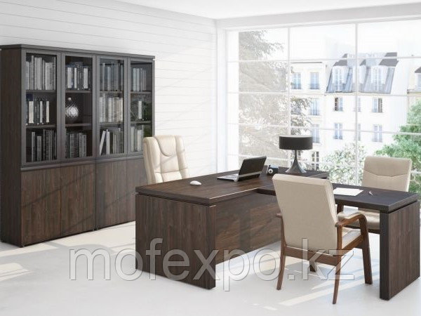 Все фасадные элементы изделий обложены массивом твердолиственных пород древесины толщиной 10 мм, придающим кабинету более дорогой статусный внешний вид. Все рабочие горизонтальные поверхности столов, приставных элементов, брифинг-приставок, подверженные повышенному износу, облицовываются высококачественным пластиком HPL в цвет ЛДСтП, повышающим прочностные характеристики лицевого покрытия. Выверенную геометрию подчеркивают ручки, выполненные из массива древесины, используемые на всех видах шкафов и тумб кабинета. Стеклянные двери также исполнены в рамке из массива древесины, а с торцевой стороны рамки предусмотрена ручка, расположенная вдоль всей ширины дверцы, выполненная также из массива.